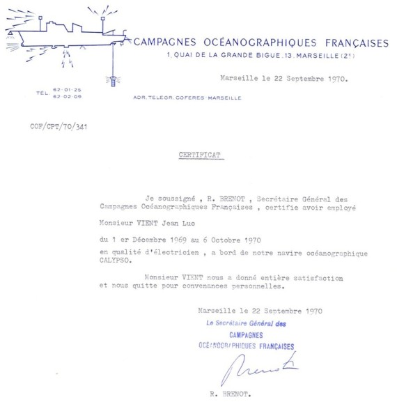 Attestation of employment issued with Mr. Jean-Luc Vient after his stays on Calypso